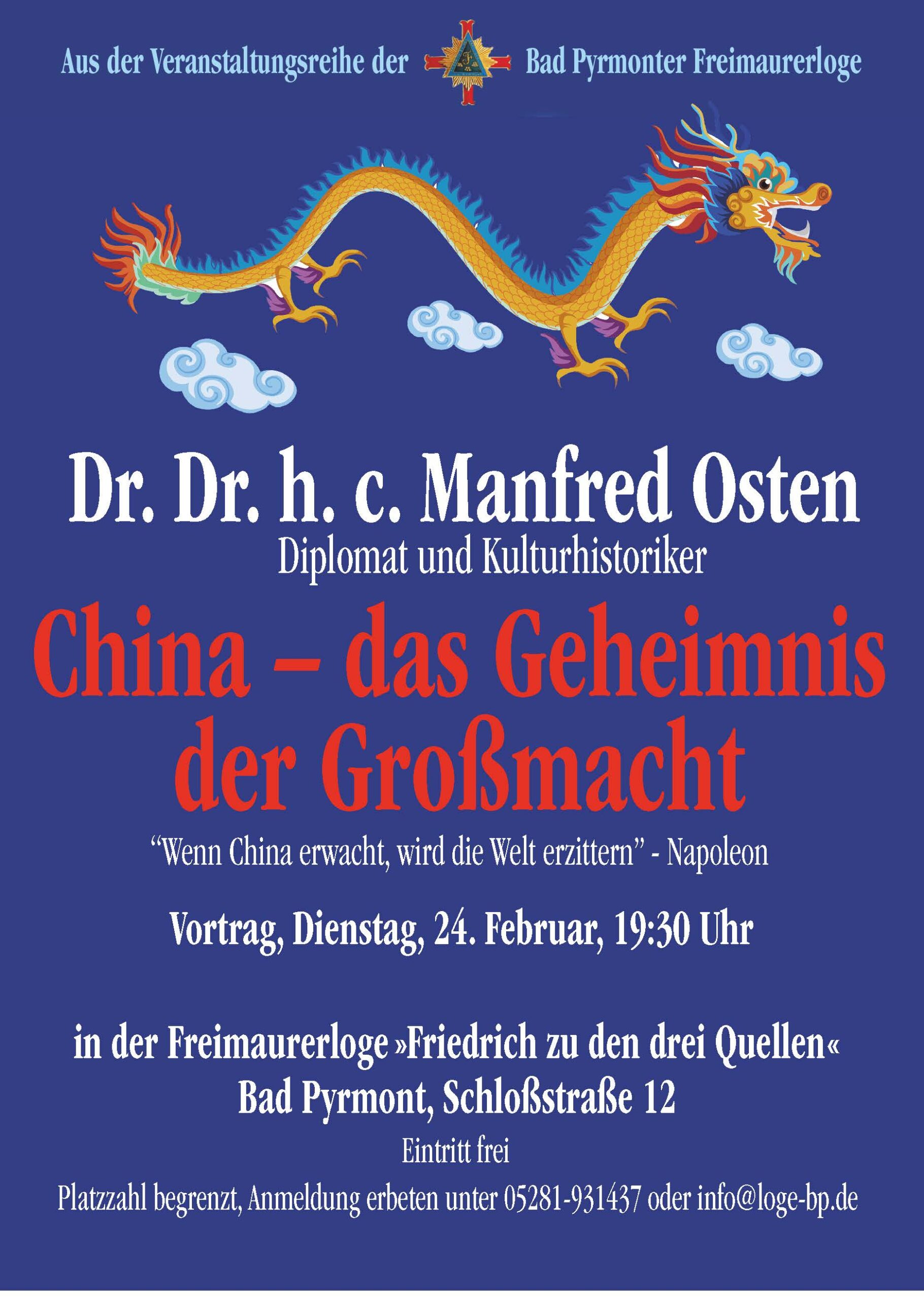 Anmeldungen erbeten beim Sekretär der Loge, Fritz Riesel, unter Telefon: 0160/94161093 oder per Mail an: fr-loge@t-online.de